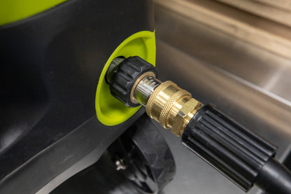 SunJoe, AR Blue Water Outlet -> M22 (15mm) Female to 3/8" Plug -> 3/8" Female Coupler -> High-Pressure Hose -> 3/8" Female Coupler -> Our MTM or Mosmatic Sprayer Kit