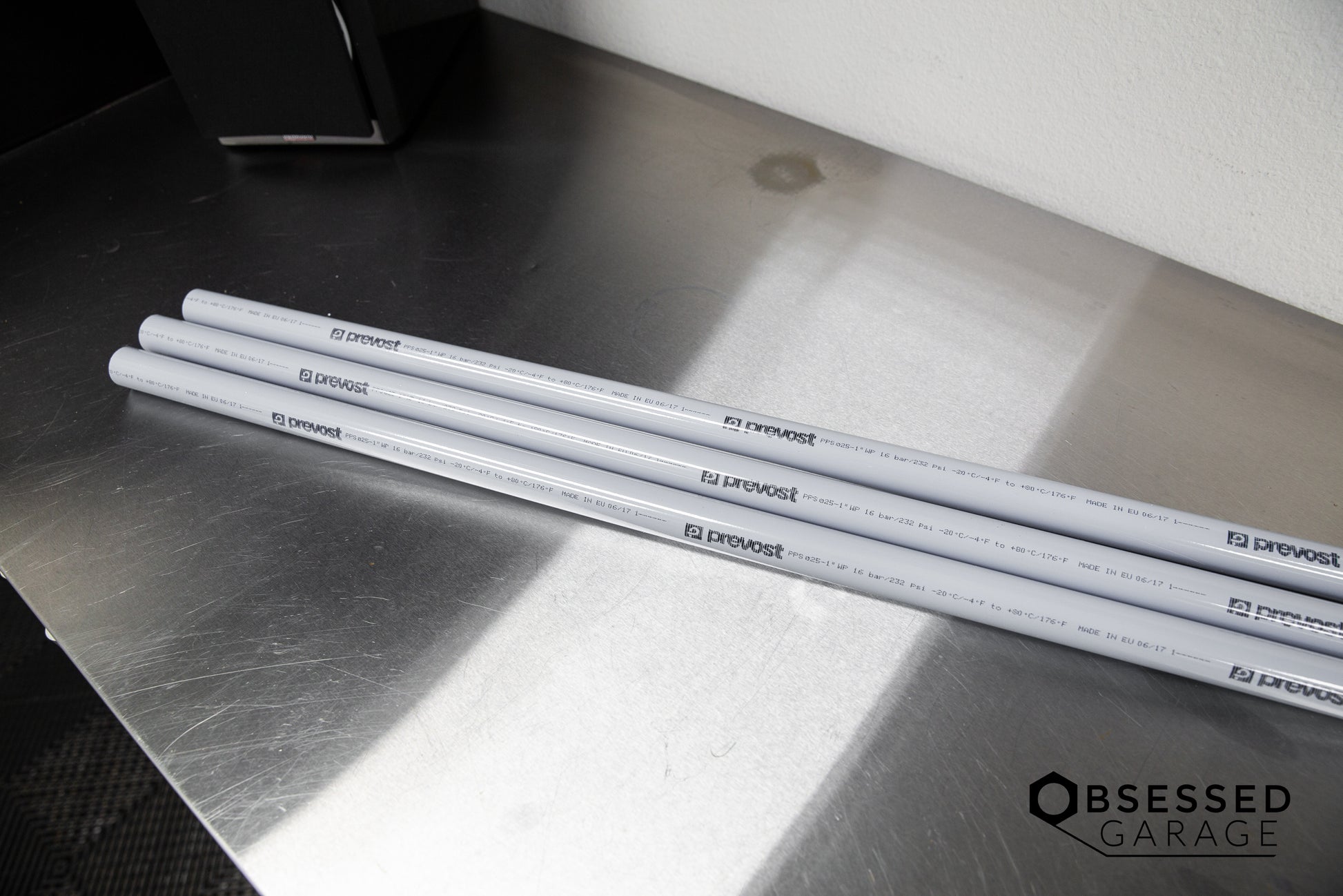 We now cut these into smaller lengths here at OGHQ into a few different sizes to make them viable for shipping to you.  This pipe comes from Prevost in 19' 7" sections. Obviously, that makes shipping very expensive.  One 20' long piece costs about $250 to ship to OGHQ.