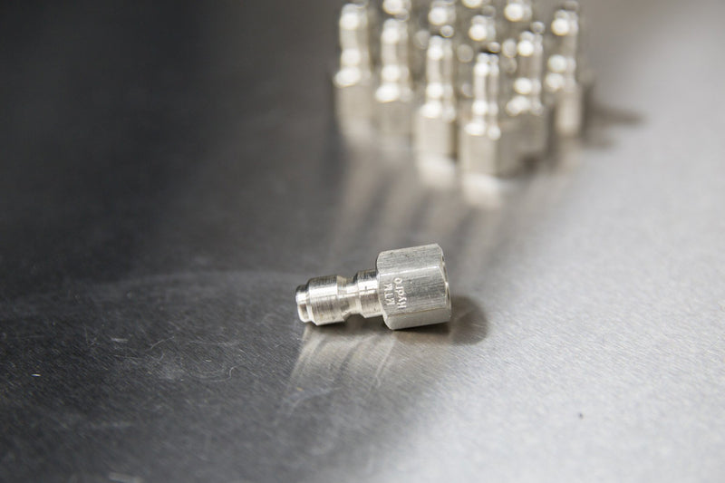 - Inlet = 1/4" Male Plug for (Quick Disconnect) QD: Ā This 1/4" male plug inserts into a female QD coupler.