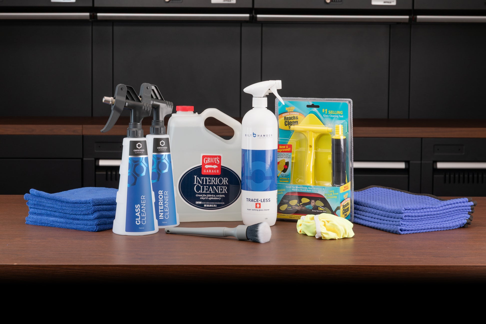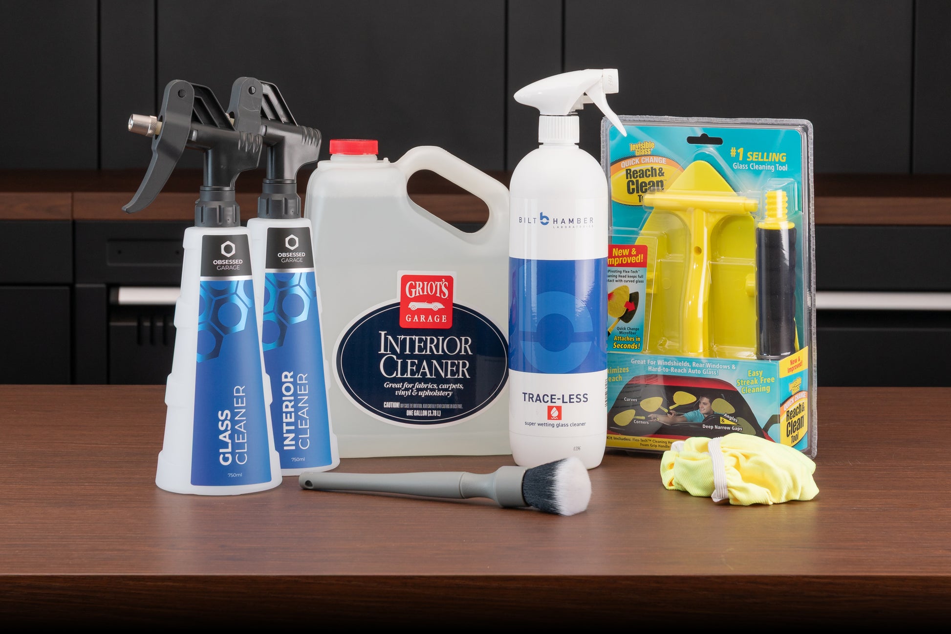 Next is the glass. This process can be tricky if you don't use the right products. Stoner's Invisible Glass & Bilt Hamber Trace-Less leaves your glass spotless. This is an alcohol-based cleaner with no soaps, detergents, scents, or dyes and it's safe on tint. Pair this with the Reach & Clean tool as well as with glass towels, and you'll get yourself a combo that cleans your glass without streaks, especially in tight spaces.