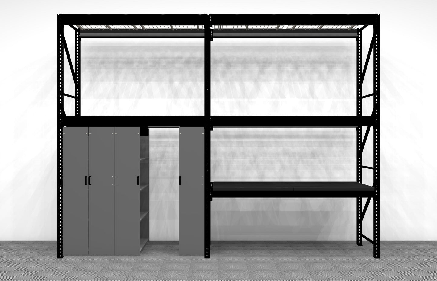 The Levrack Workstation Plus with Overhead Storage is the ultimate version of the Levrack Workstation. You'd get this option if you want to maximize storage space while also adding a worktop to your Levrack Storage Solution. This workstation adds another level to your workstation to match your Levrack, which also has overhead storage.