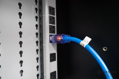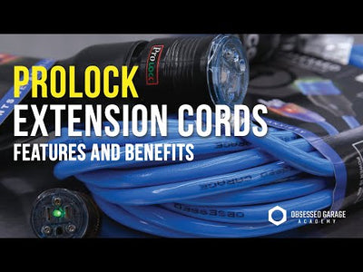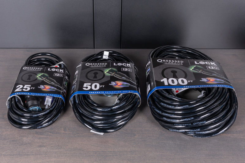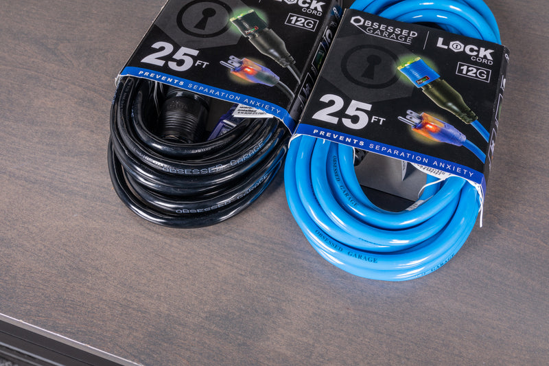 These are a 12/3 AWG locking extension cord, each conductor contains 65 strands of 30AWG 100% copper wire. The plug locks when a standard U-Ground 15A-125V plug is inserted and will hold up to 80 lbs of pull resistance. To unlock your cable, simply pull back on the blue-collar and remove your plug. The locks are made of high-impact polycarbonate, they can take a beating & they won't shatter. When I first saw the wire jacket on the cord I instantly thought it wouldn't be very flexible since it's shiny PVC, I was wrong. The jacket is a specialized PVC that will keep flexibility until -58F (-50C).