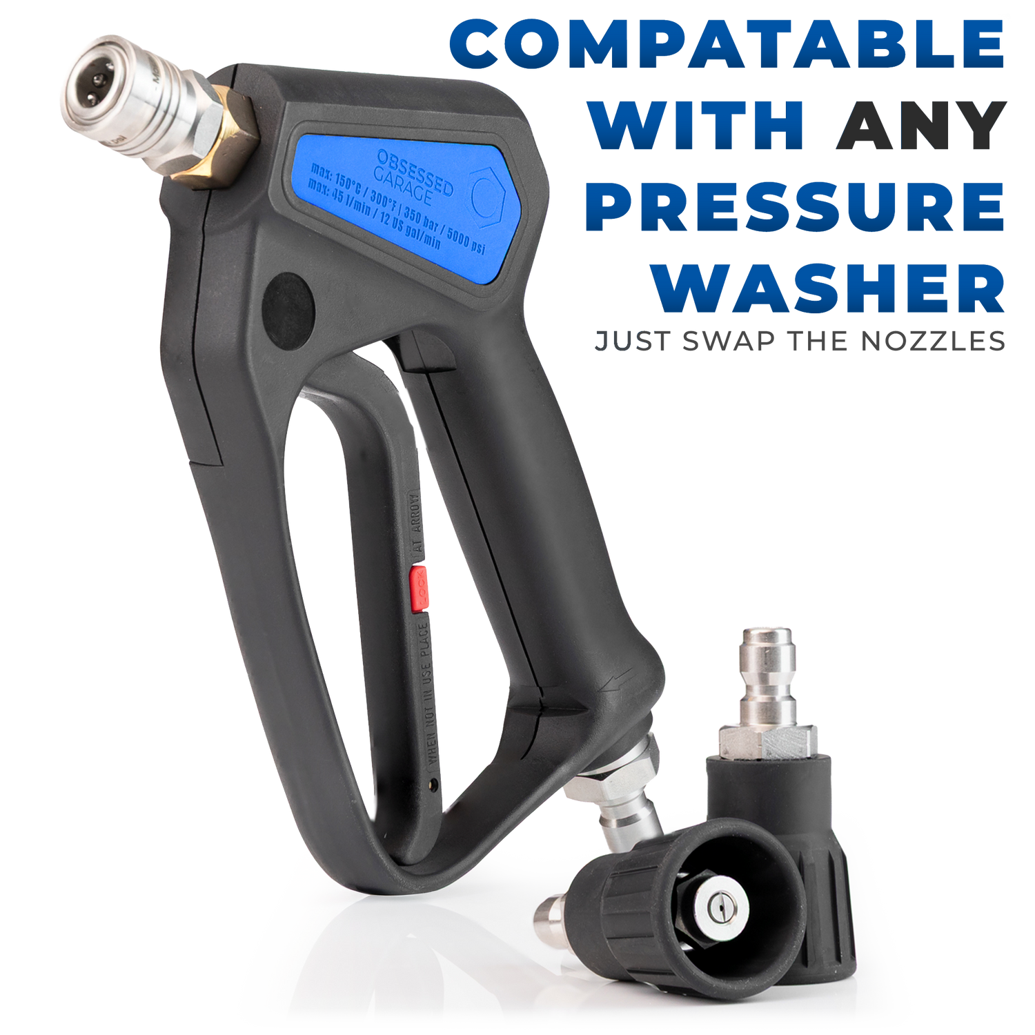 It's the same Mosmatic sprayer you're used to but what makes this one special are these new T304 stainless fittings that are developed by Mosmatic and manufactured to high precision in Europe. The biggest difference between the original and OG Spec sprayer is the integrated swivel and plug which takes about an inch off of the inlet. The outlet is a Swiss-made T304 coupler adding to why this is the best pressure washer sprayer in existence.