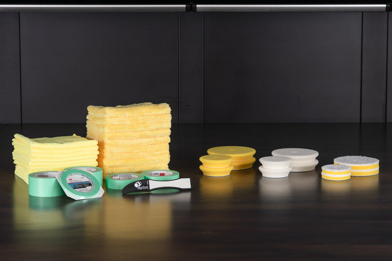 3M Precision Masking Tape also comes in this kit in three sizes: ¼”, 1”, and 2”. I used to carry the purple 3M tape, which was good, but I found it to be too thick and hard to tear. Having this thinner tape makes it much simpler to get into corners and around headlights. I also wanted towels, so we included low and high pile polishing towels and a claw tool. The claw tool comes in clutch.