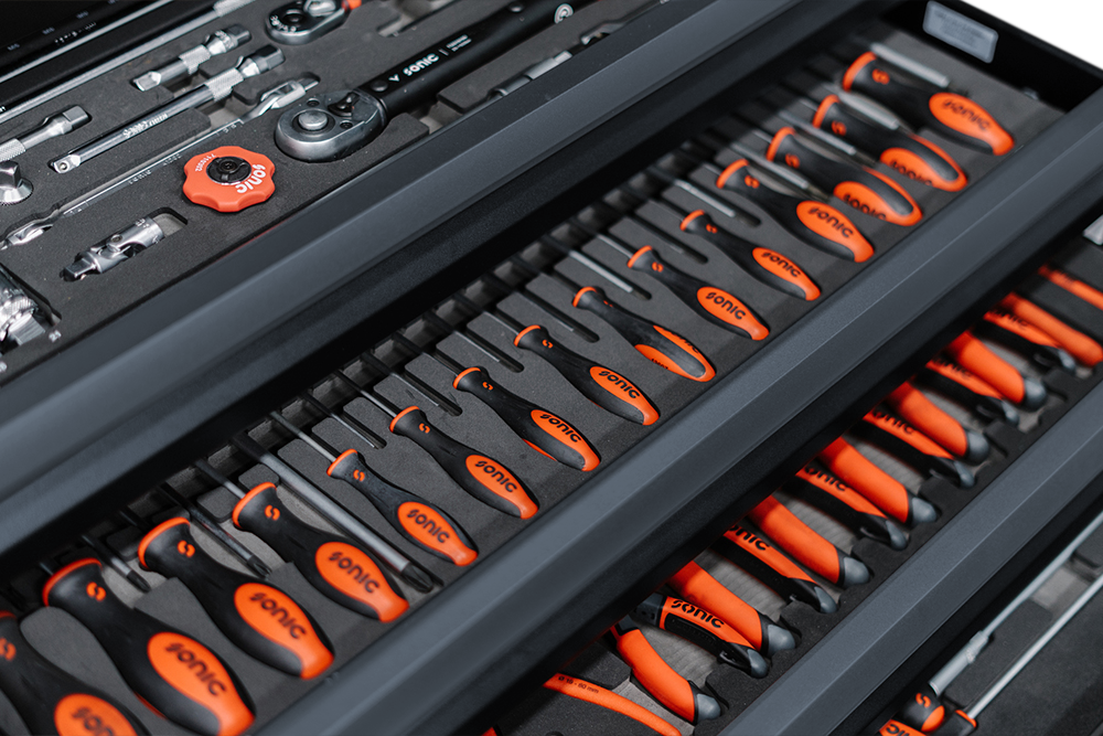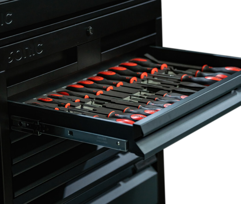 When you buy tools with cabinets you save 20% on tools. Every NEXT MSS drawer is sized to fit Sonic Foam inlays (sizes L, M and S dependent on cabinet), allowing your tool organization system to scale seamlessly across your entire setup. The result is a professional workspace where tools, storage, and workflow come together without compromise.
