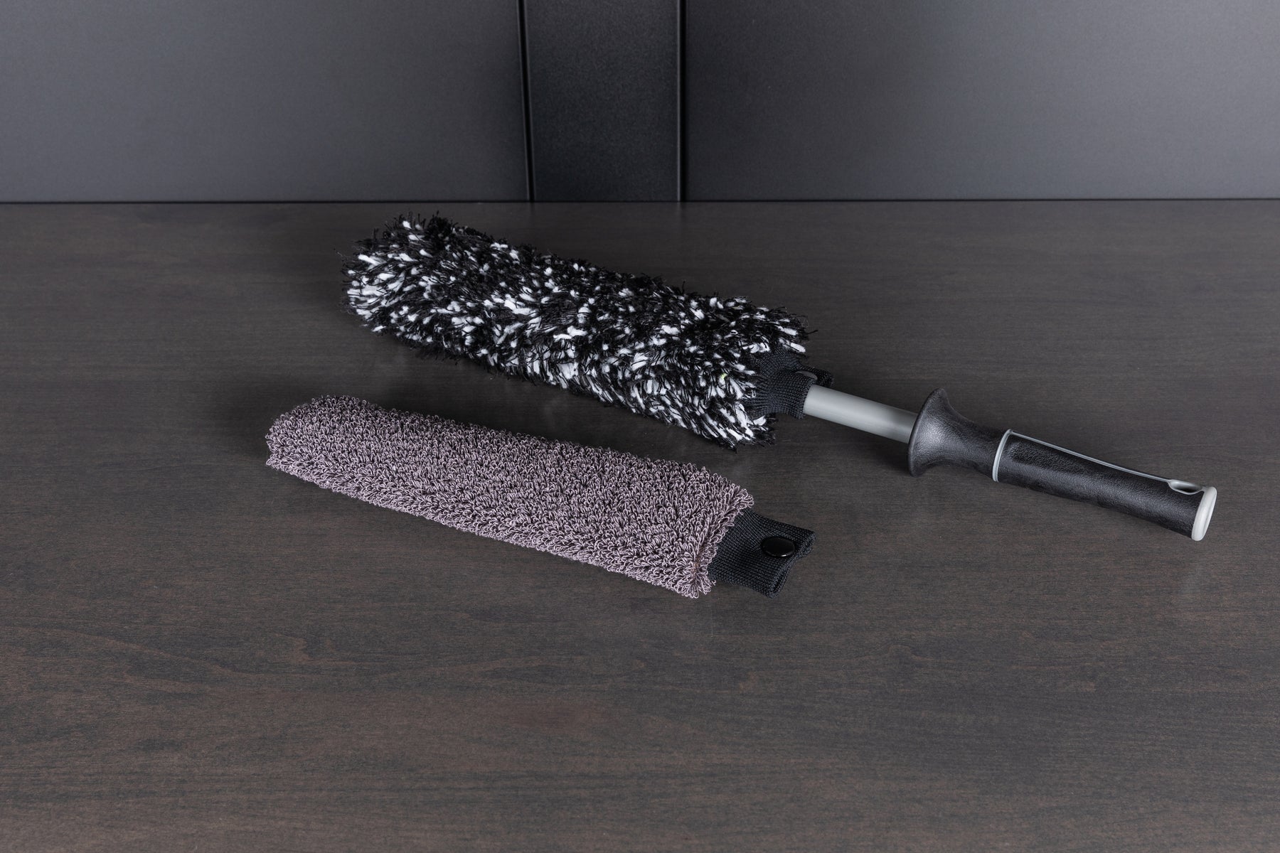 The brush comes with two different covers, one is a microfiber cover which is okay (I still recommend the Microfiber Madness Incredibrush flat cover, which you can use with this handle if you trim some of the foam tip off). You'll get a second scrubbing cover with the brush, I only recommend using this if you don't care about your wheel finish. The scrubbing cover should only ever be used on the barrel of your wheels or on the inside of the exhaust tips if you cannot get them clean with the microfiber cover!