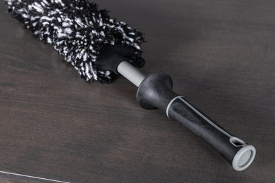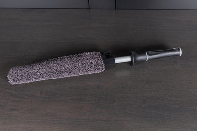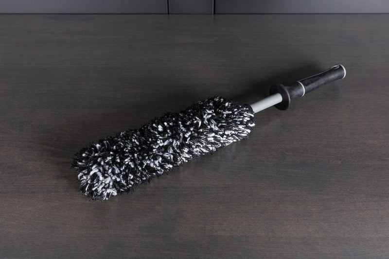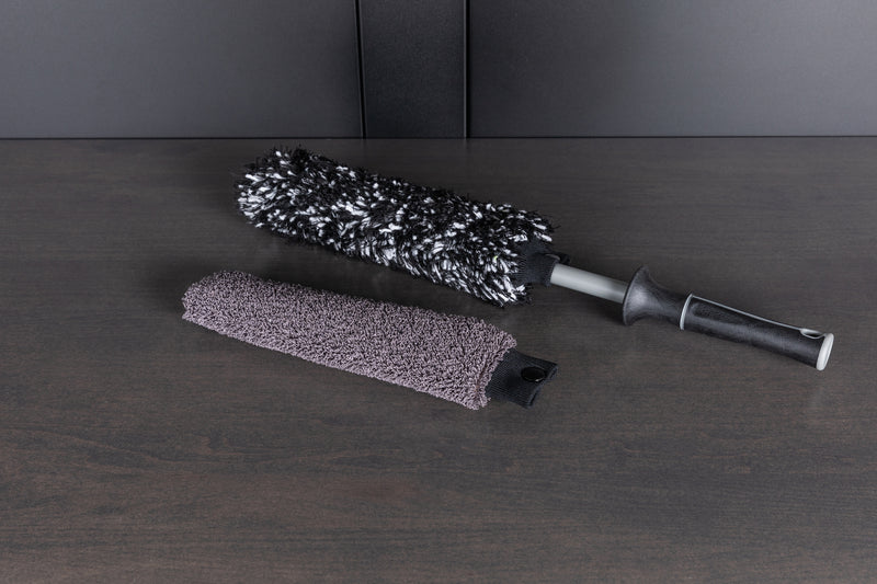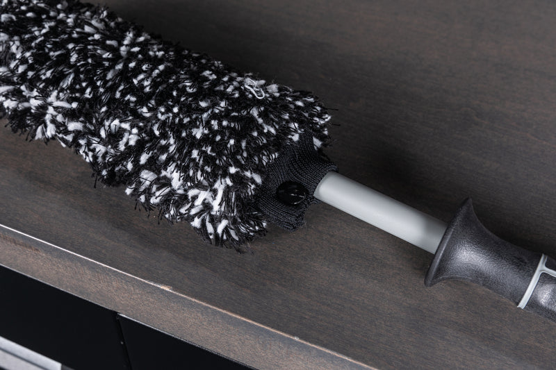 After the handle on the Microfiber Madness Incredibrush changed, I wanted to replace it with a new brush with a better handle. The Detail Factory brush is the better version of the Incredibrush, it has the same type of foam core for the brush cover but isn't as flexible (I hate when the wire brush core bends & I cannot scrub the wheel barrels easily). The grip on the Detail Factory brush is a lot better, it has a solid rubber handle and is molded onto the core of the brush. This handle will last a lot longer than any previous brushes we've sold.