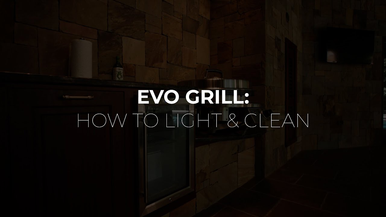 Instructions for using the EVO flattop grill: Clean with supplied scraper while warm, avoid heavy cleaners. Scrub with avocado oil and pad, wipe excess oil with towel, use provided cleaner for final wipe down.