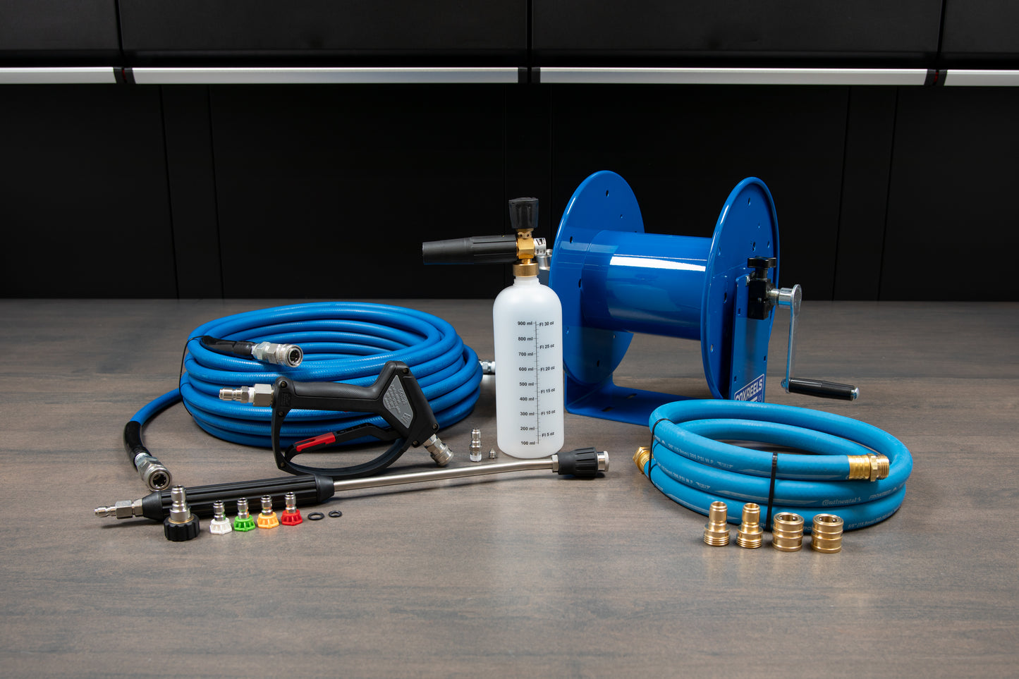 This is the answer to all of your pressure washing preparation woes. What I really like about having this accessory package is how easy it is to pull everything together. No more wheeling things around or connecting your pressure washing hose to a bib. Everything is in a static position, and it makes detailing your car more desirable. No more setting anything up— exactly what I want.