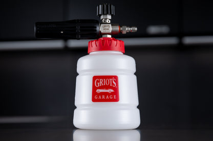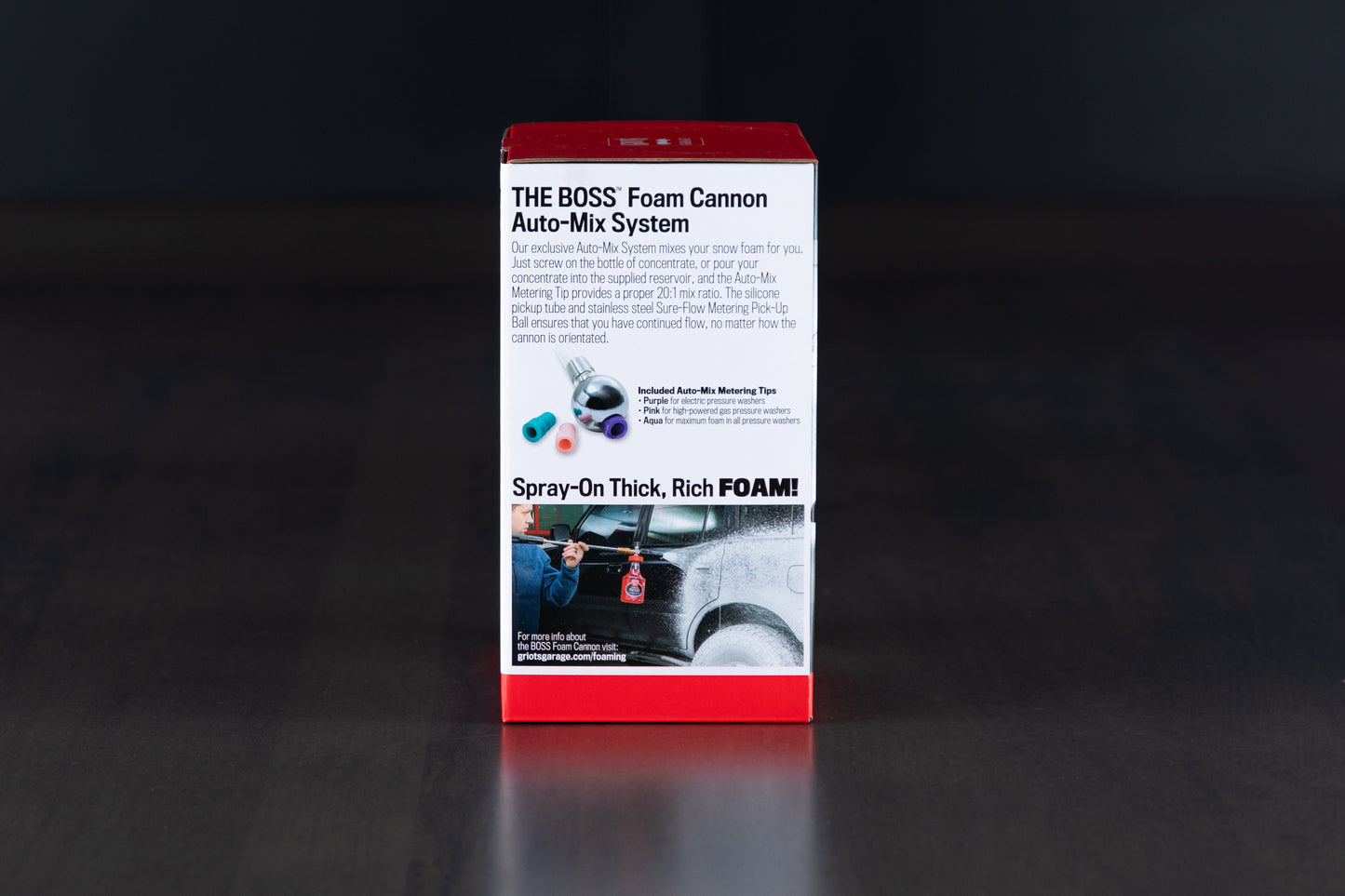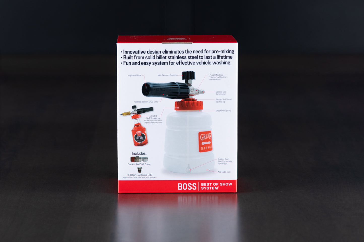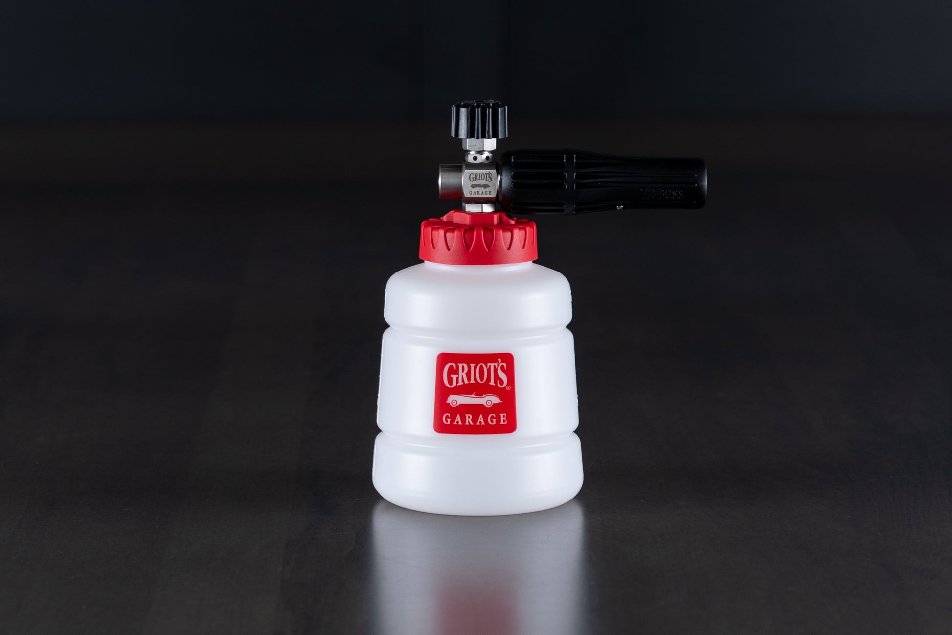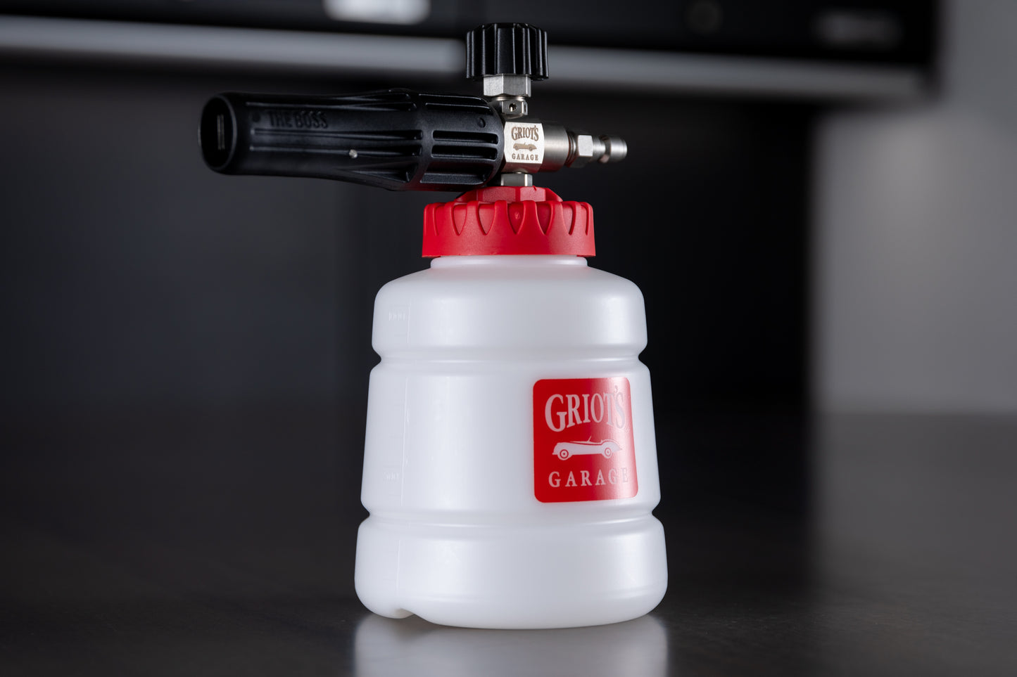 The Griot’s Garage The Boss Foam Cannon is now the best foam cannon available. It has several innovations and features that make it easier to use, more durable, and higher quality than other foam cannons on the market. You can see the full spec list below, but I think the stand-out features are the stainless steel construction, the wide-mouth bottle, and the flexible, weighted suction tube with metering tips.