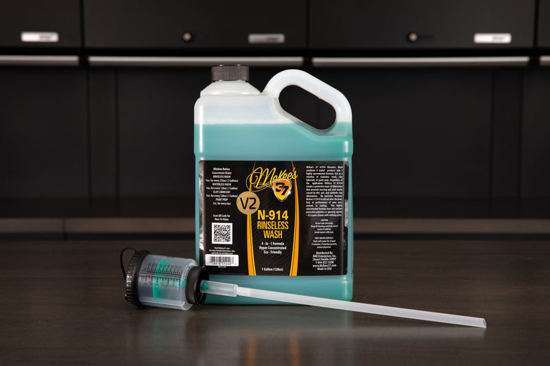 If you want to use N-914 as a rinseless wash you'll use 1 ounce of N-914 for every 2 gallons of water (1:256), 3 capfuls of N-914 equals one ounce. So if you're going to use our 6 gallon bucket with the full 6 gallons you'll need 9 capfuls of N-914. Distilled or filtered water is recommended but not necessary.