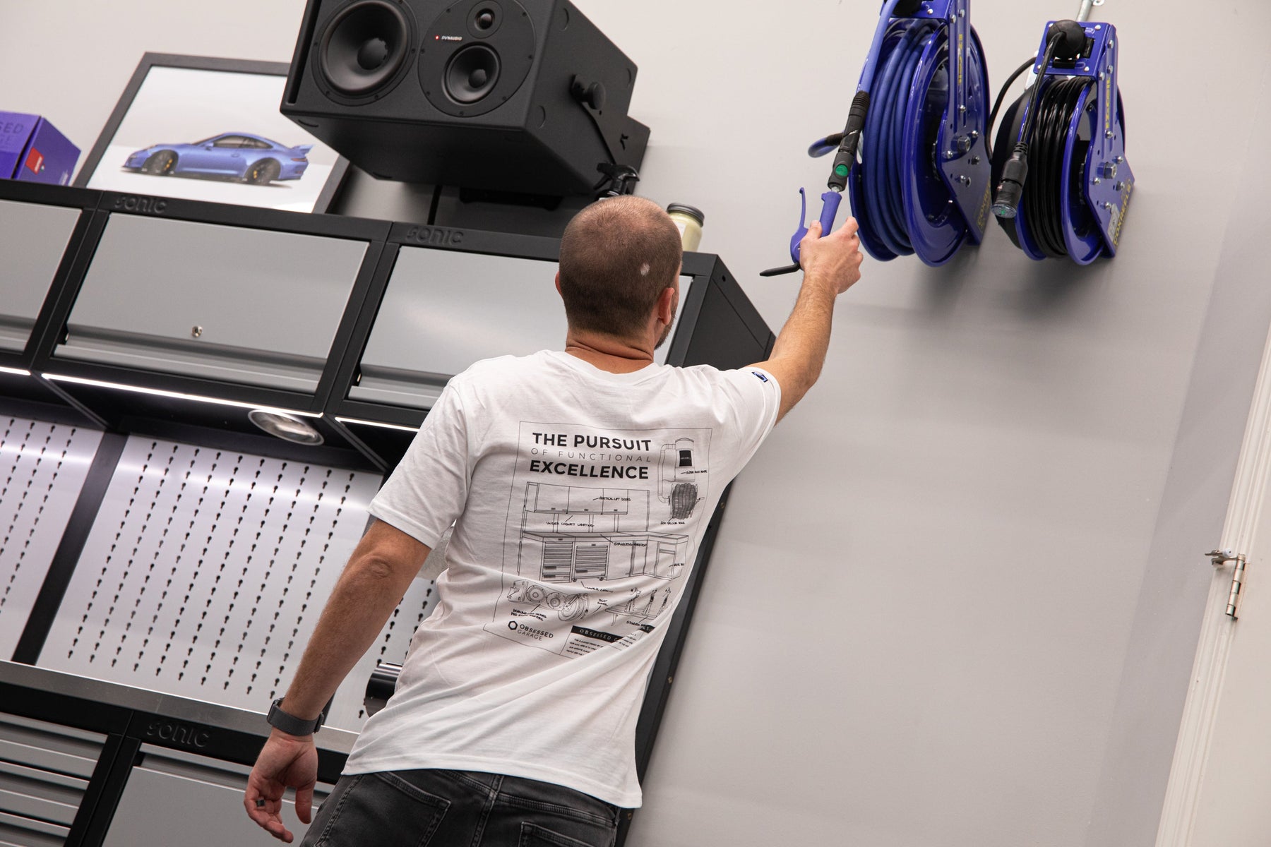 We first launched this T-shirt for the 2023 garage giveaway. We designed it to showcase what the garage is all about for us - the pursuit of functional excellence! It was such a big hit that we decided to bring it to the store full-time. One of Matt's favorite shirts, this shirt comes in either white or carbon, a dark gray color.