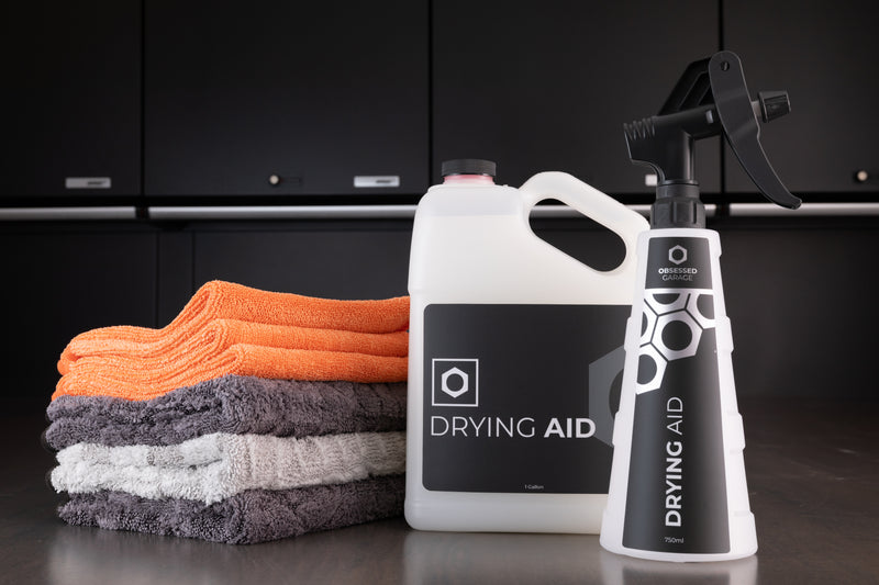 The Obsessed Garage Drying Aid is finally here. We’ll be carrying it in three different sizes - 32-ounce, 1-gallon and 5-gallon containers. This product is designed to be used on the last step of your car washing process - when you’re drying your vehicle. What you’re ultimately doing with any drying aid solution is adding lubrication and protection to your paint. Now, once I made the transition from car wax to ceramic coating, some of the spray wax sealants I was accustomed to using weren't so great. Not great, meaning they would leave streaking on my paint.