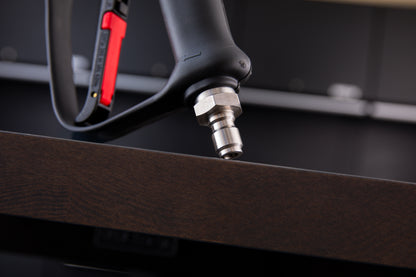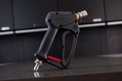 It's the same Mosmatic sprayer you're used to but what makes this one special are these new T304 stainless fittings that are developed by Mosmatic and manufactured to high precision in Europe. The biggest difference between the original and OG Spec sprayer is the integrated swivel and plug which takes about an inch off of the inlet. The outlet is a Swiss-made T304 coupler adding to why this is the best pressure washer sprayer in existence.