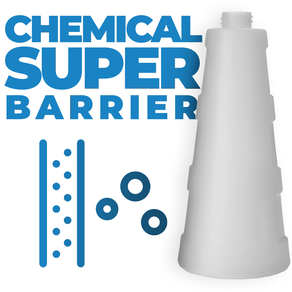 The bottle has been enhanced through a fluorination process that bonds fluorine atoms to the plastic’s surface, altering the composition of the plastic itself. Fluorination improves the chemical resistance and barrier properties of the bottle, mitigating the permeation of liquids and vapors. If a bottle allows permeation, paneling (bottle deforming due to vacuum) will occur. The ProSeries bottle will not panel and can store almost any detailing chemical.