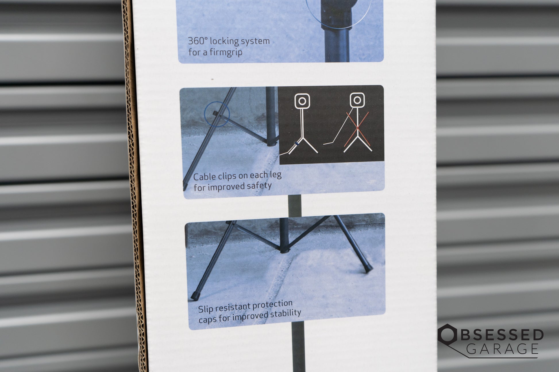 To increase safety when in use, work light cables can be stored in the safety clips placed on each of the tripod legs.