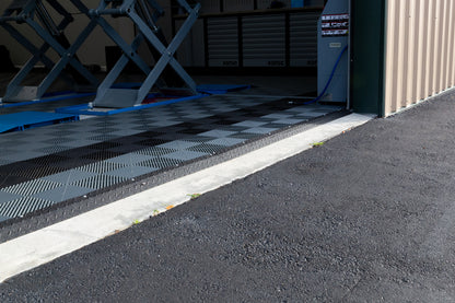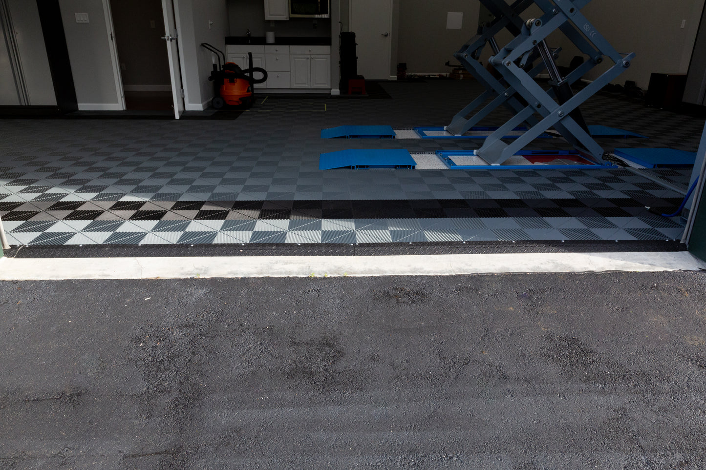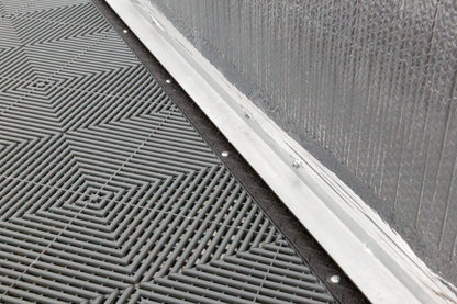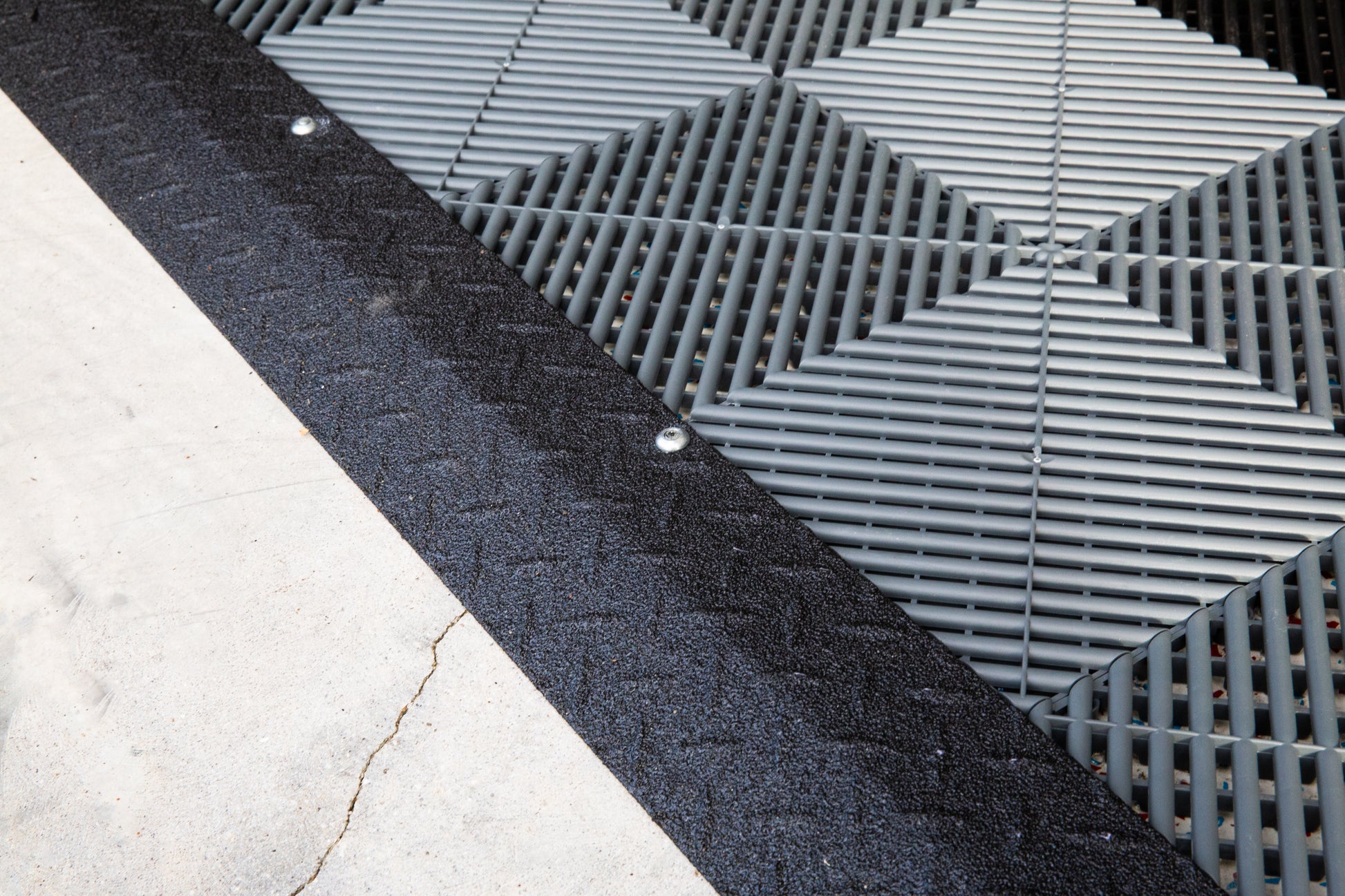 Ever since getting a forklift, I realized we needed something more robust than the Swisstrax edge pieces to stop them from coming undone and getting ruined constantly. This is where Treadware comes into play. This essentially mounts on top of the edge of your Swisstrax tiles (without edge pieces) and creates a smoother (and more robust) transition for you to drive over. It only comes in one size (6" x 6" x 70") but it can be easily trimmed to any size with an angle grinder. I used expandable concrete anchors to anchor it into the concrete at OGHQ. We also sell a version that looks chrome, but I prefer the textured black version for a cleaner and more modern look.