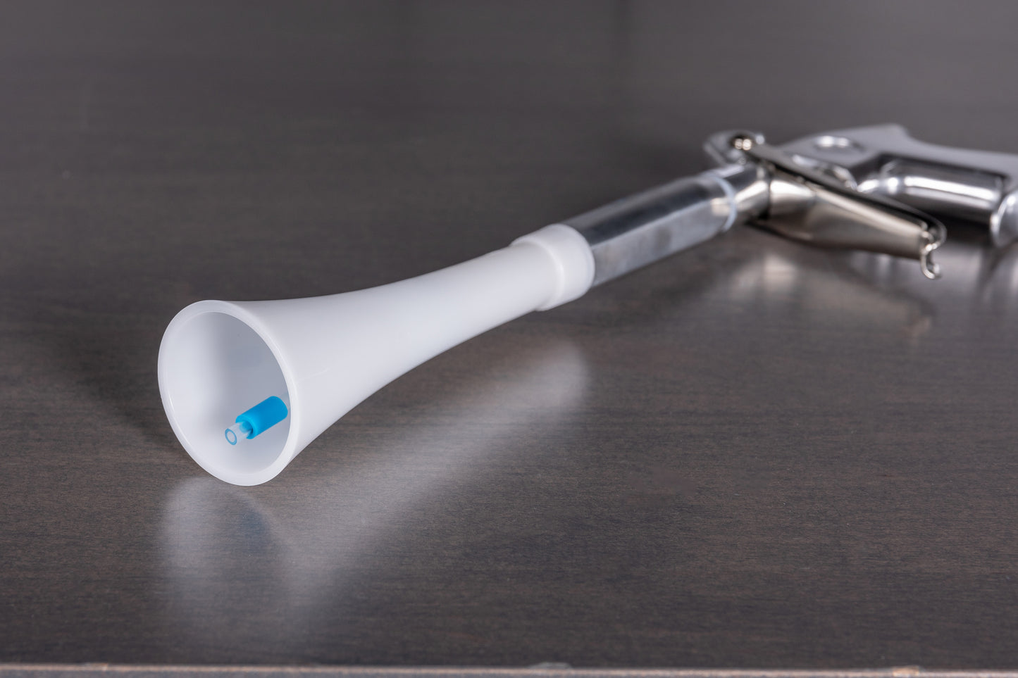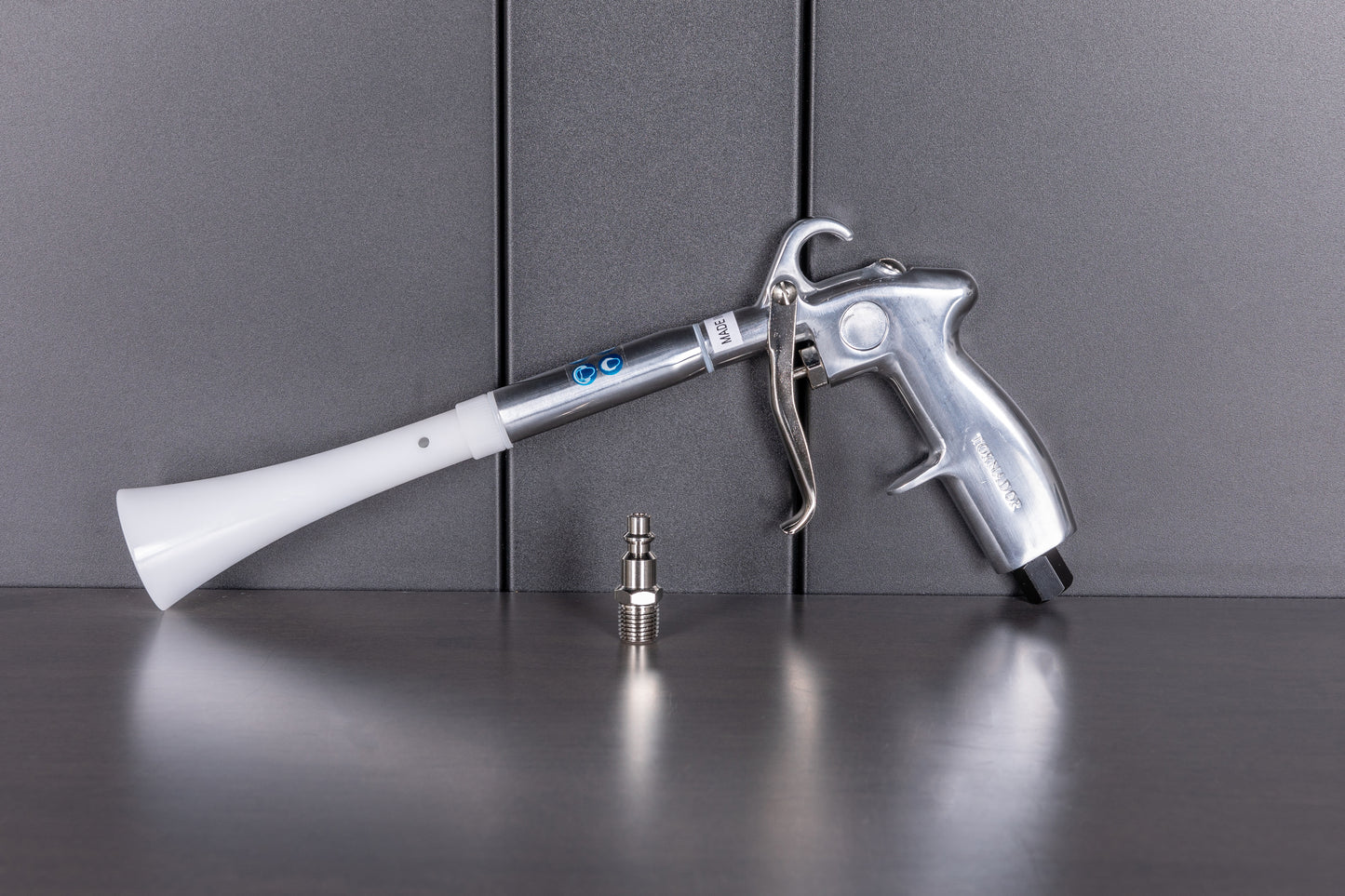 So, how exactly would you use this? You’d use it with an air compressor operating between 60 and 90 psi. There’s a tube with a weight on it within the cone that spins really fast. The cone channels air into a powerful tornado-like motion that quickly lifts dirt and moisture from any surface, blowing things out more efficiently and effectively.