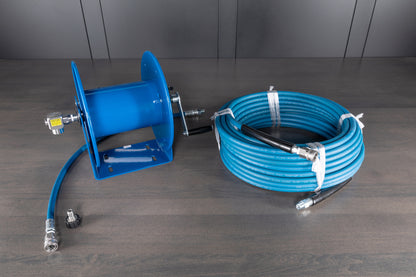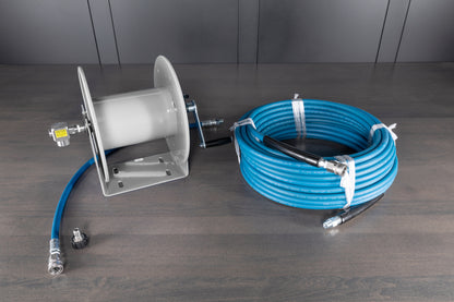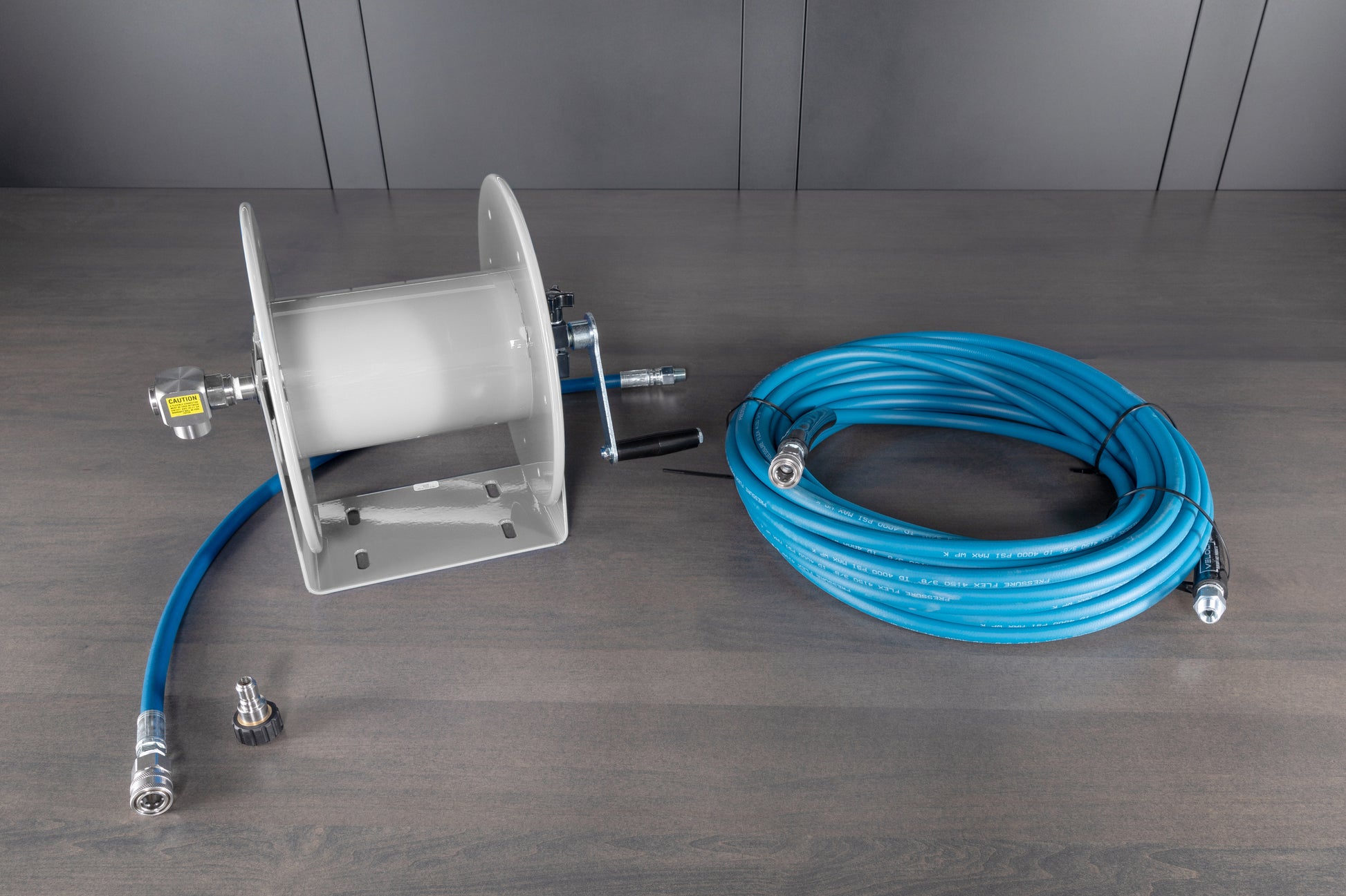 In our pursuit to make buying pressure washer accessories easier, we made this wall-mount hose reel kit that includes everything you need to put a  High-Pressure Hose on a hose reel and connect it to your pressure washer.