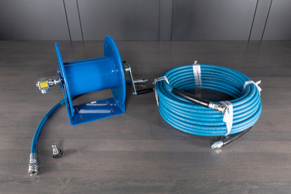 • Reel Type: Manual hand-crank wall-mount reel, powder-coated steel construction, designed for high-pressure applications. Mounts securely to any stud or masonry surface.